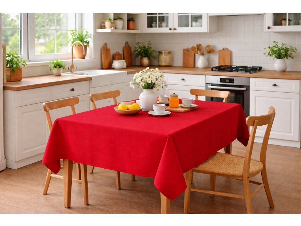 Jednobarevný ubrus ze 100% bavlny doporučujeme doplnit napronem (menší středový ubrus 80 x 80 cm) nebo štolou (středový pás, běhoun). Vybírejte z jednobarevných či vzorovaných ubrusů.