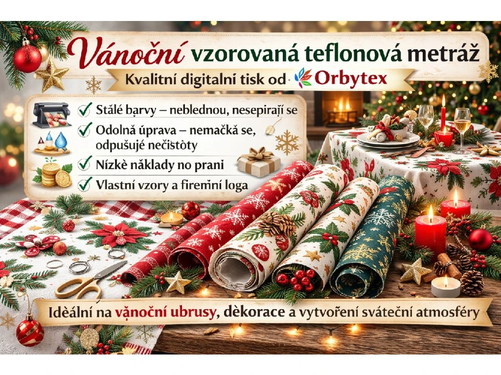 Vzorovaná teflonová metráž s vánočními motivy je ideální volbou pro vytvoření pravé vánoční atmosféry v domácnosti i komerčních prostorách. Látku tiskneme v naší firmě Orbytex pomocí kvalitního digitálního tisku, který zaručuje syté a dlouhodobě stálé barvy.