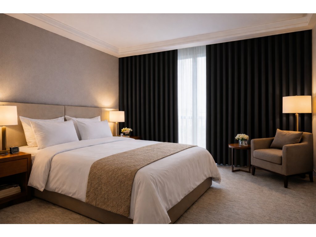 Díky oboustrannému provedení mají závěsy jednotný vzhled z obou stran, což je praktické řešení pro obytné interiéry, hotely, kanceláře, kina, konferenční a prezentační prostory. Černý odstín působí elegantně, minimalisticky a profesionálně a snadno se kombinuje s kontrastními i neutrálními prvky interiéru.