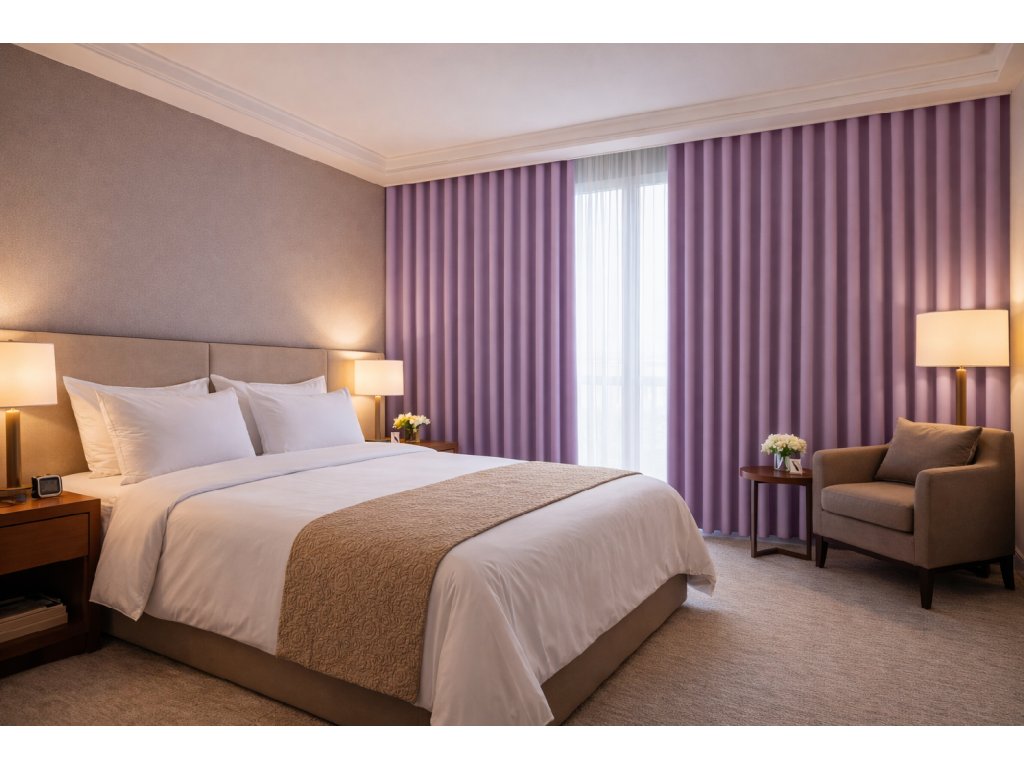 Díky oboustrannému provedení mají závěsy jednotný vzhled z obou stran, což je praktické řešení pro obytné interiéry, ložnice, hotely, wellness prostory i reprezentativní místnosti. Lila odstín působí klidně, romanticky a elegantně, opticky zjemňuje prostor a snadno se kombinuje s neutrálními i pastelovými barvami.