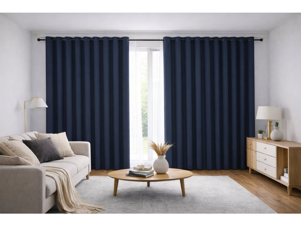 Modré oboustranné blackout závěsy Orbytex jsou ideální volbou pro interiéry, které hledají nadčasový vzhled v kombinaci s vysokou funkčností. Kvalitní blackout tkanina poskytuje účinné zatemnění, maximální soukromí a přispívá k tepelné i částečně zvukové izolaci prostoru.